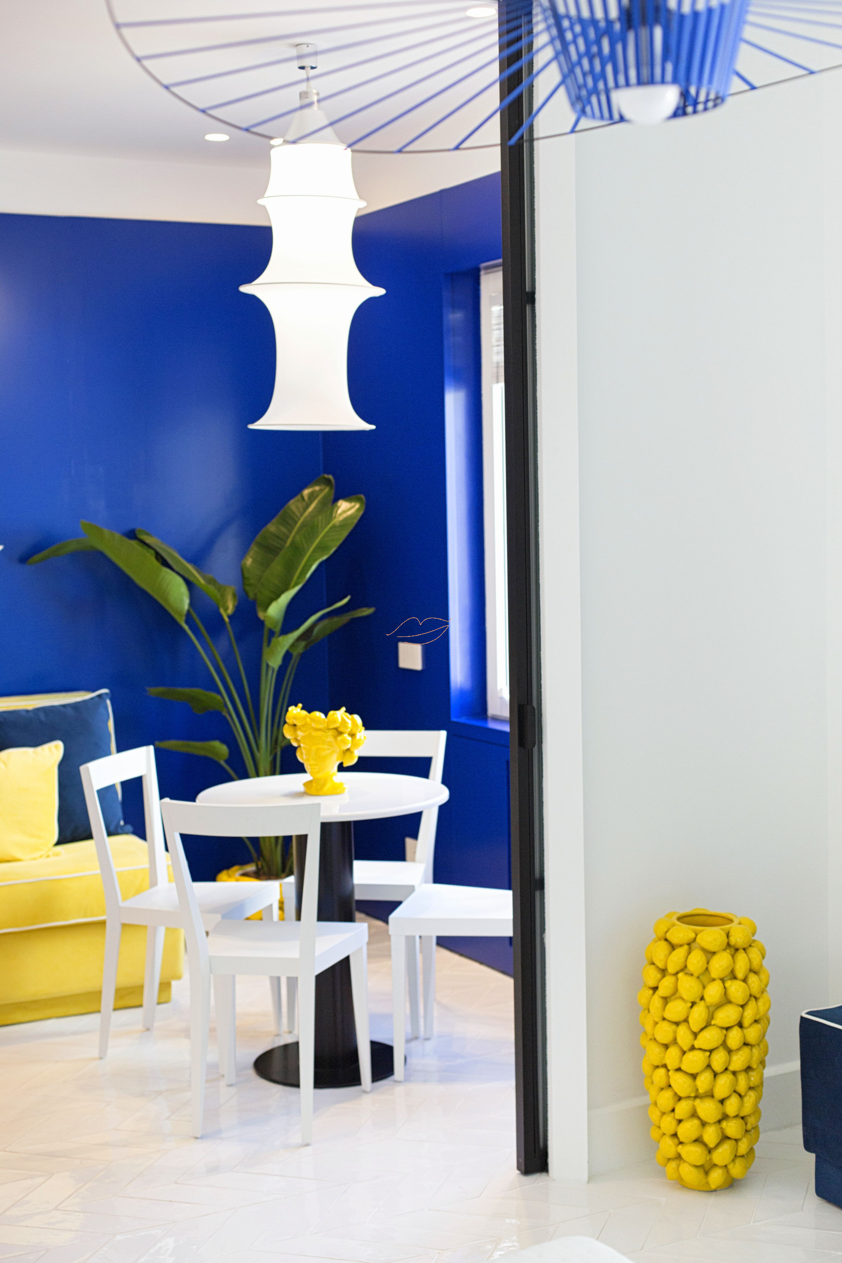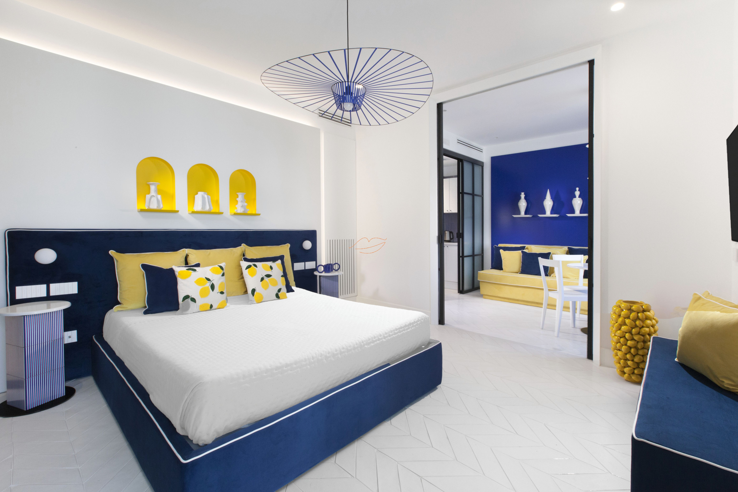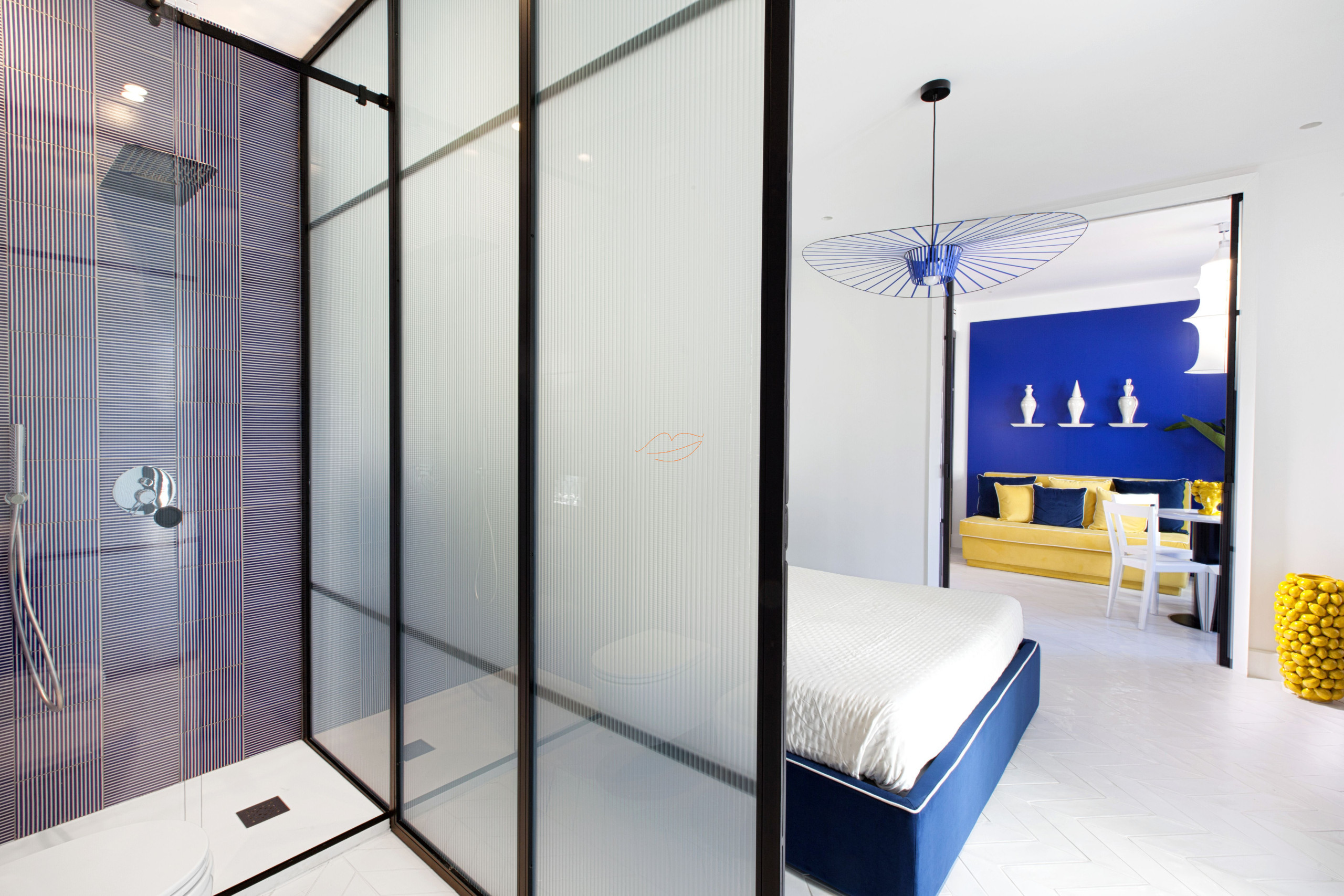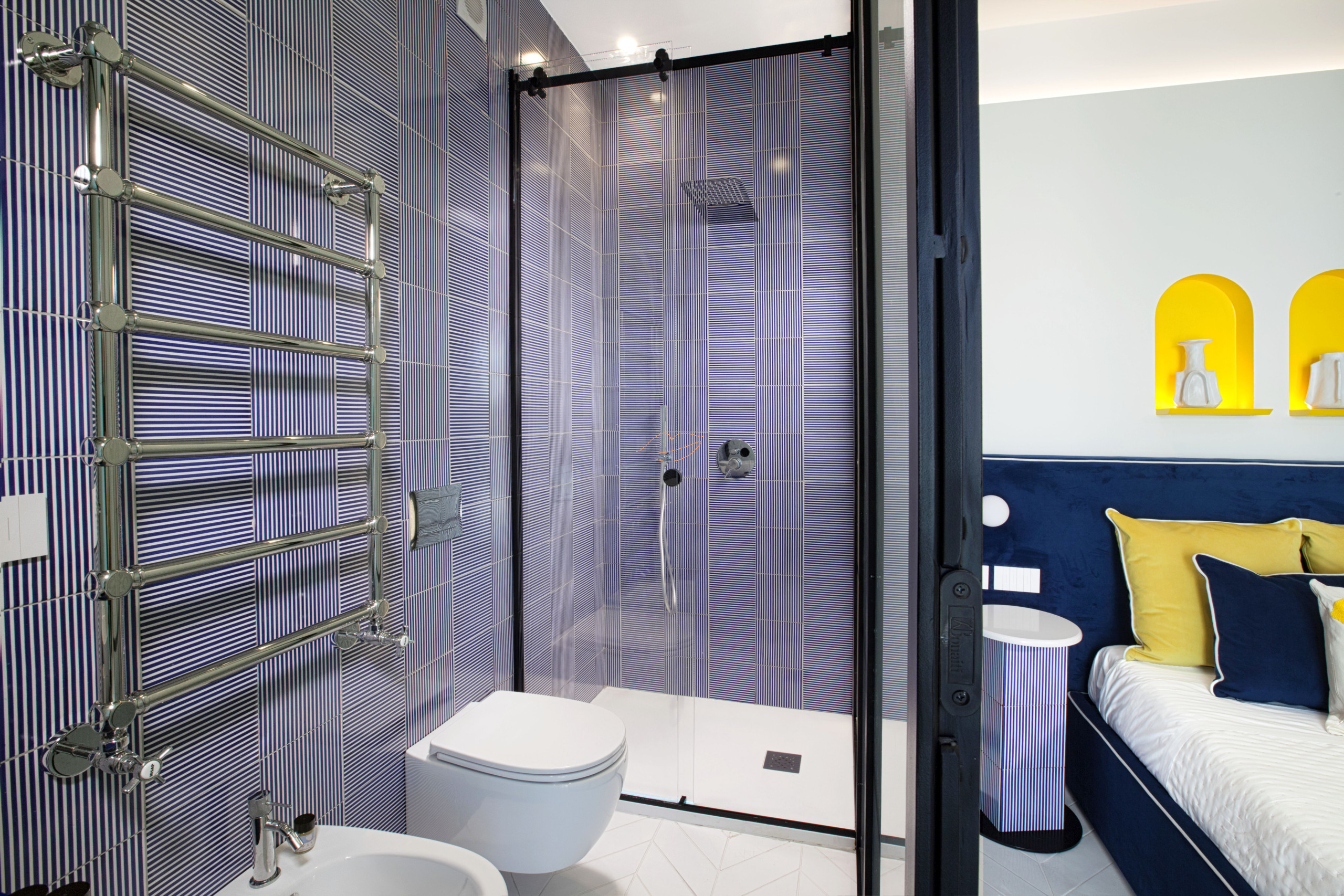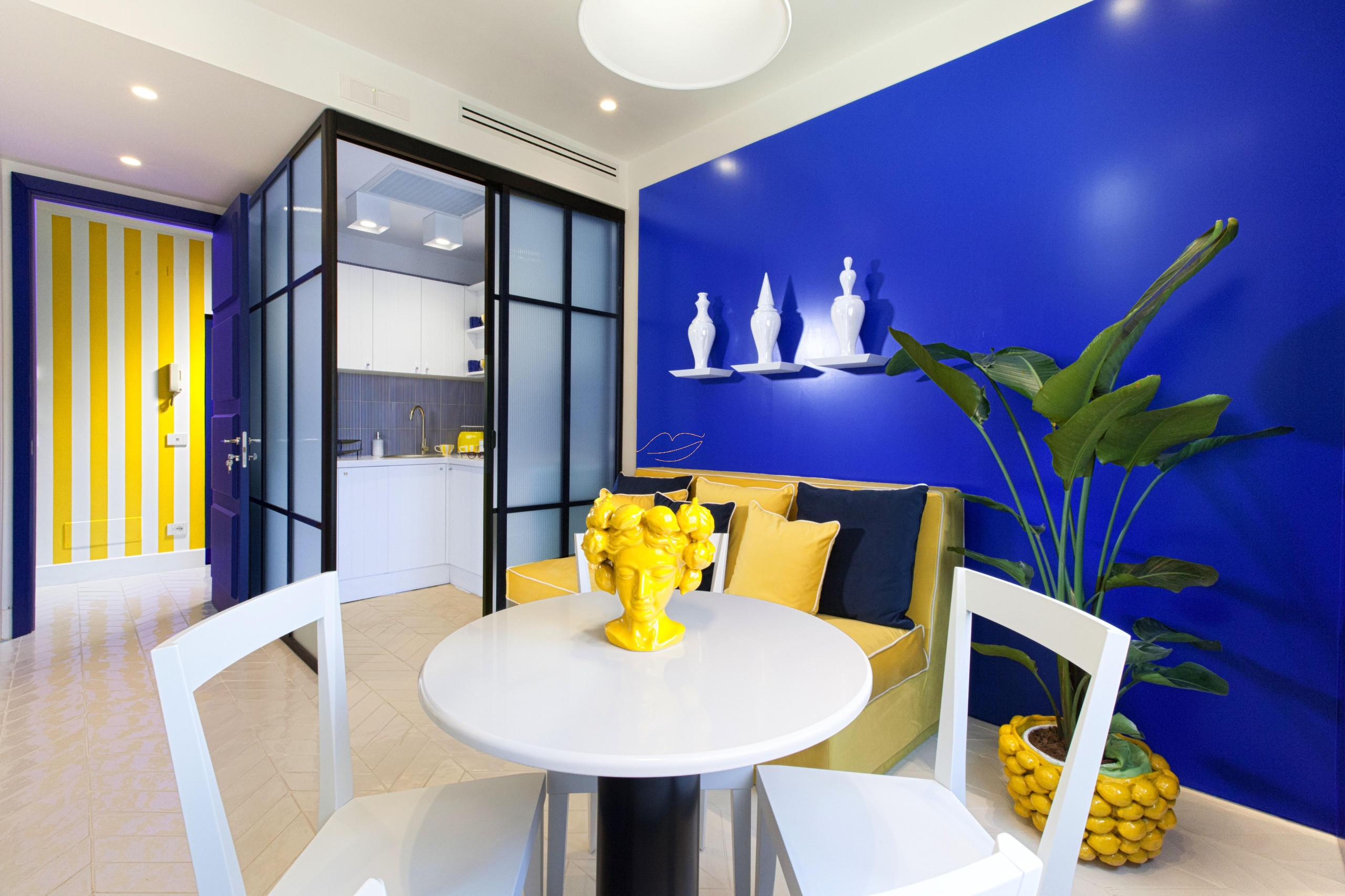 Beim Betreten finden wir eine Küche, ein Schlafzimmer mit einem geräumigen Doppelbett, ein Badezimmer mit Dusche und Kleiderschrank. Das Zimmer verfügt über eine private Außenterrasse mit Blick auf die Via Marziale. Alles ist in Blau- und Gelbtönen gehalten.