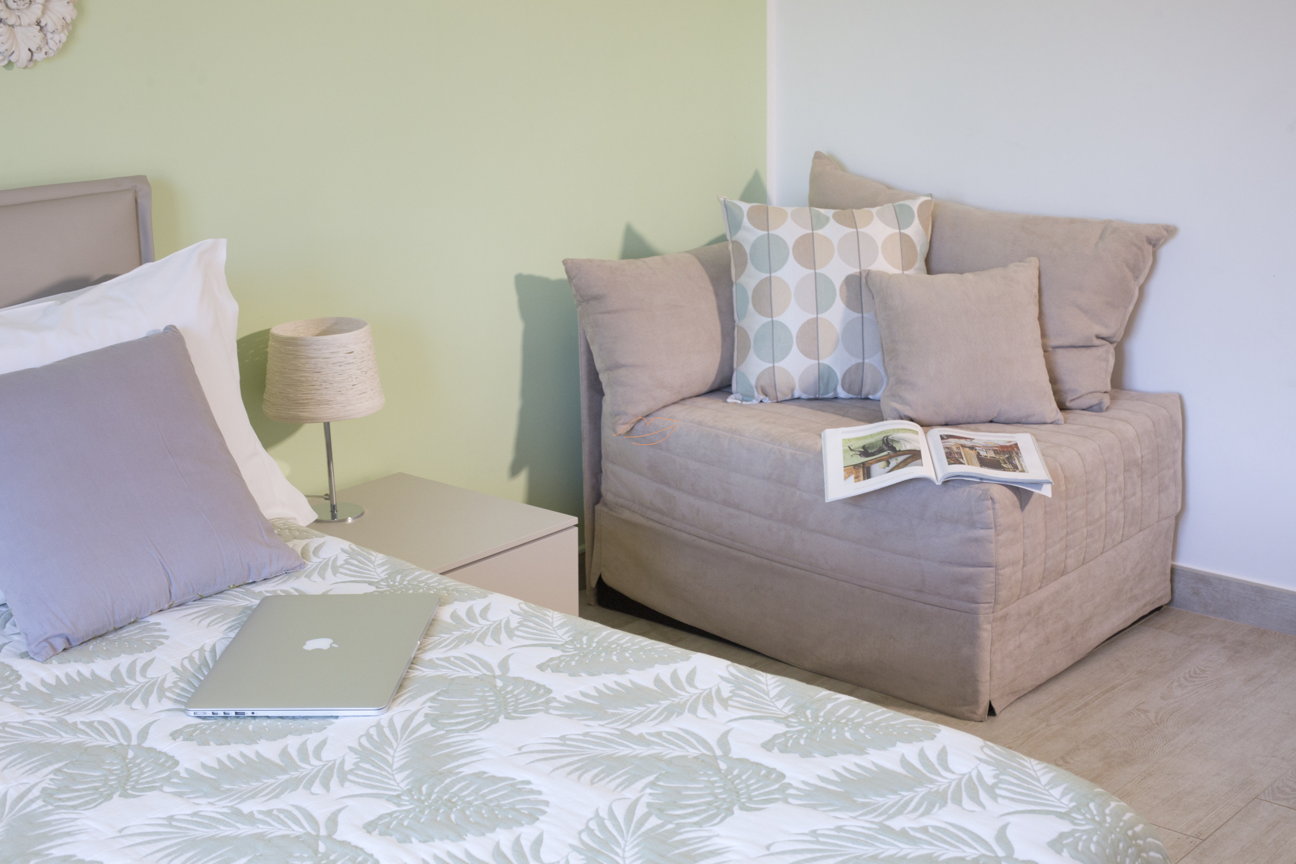 Die Wohnung besteht aus einem Schlafzimmer und einem Zimmer mit zwei Einzelbetten, der Wohnbereich verfügt über ein Doppelbettsofa. Die geräumige Küche ist gut ausgestattet mit Herd, Kühlschrank, Ofen und Geschirrspüler.