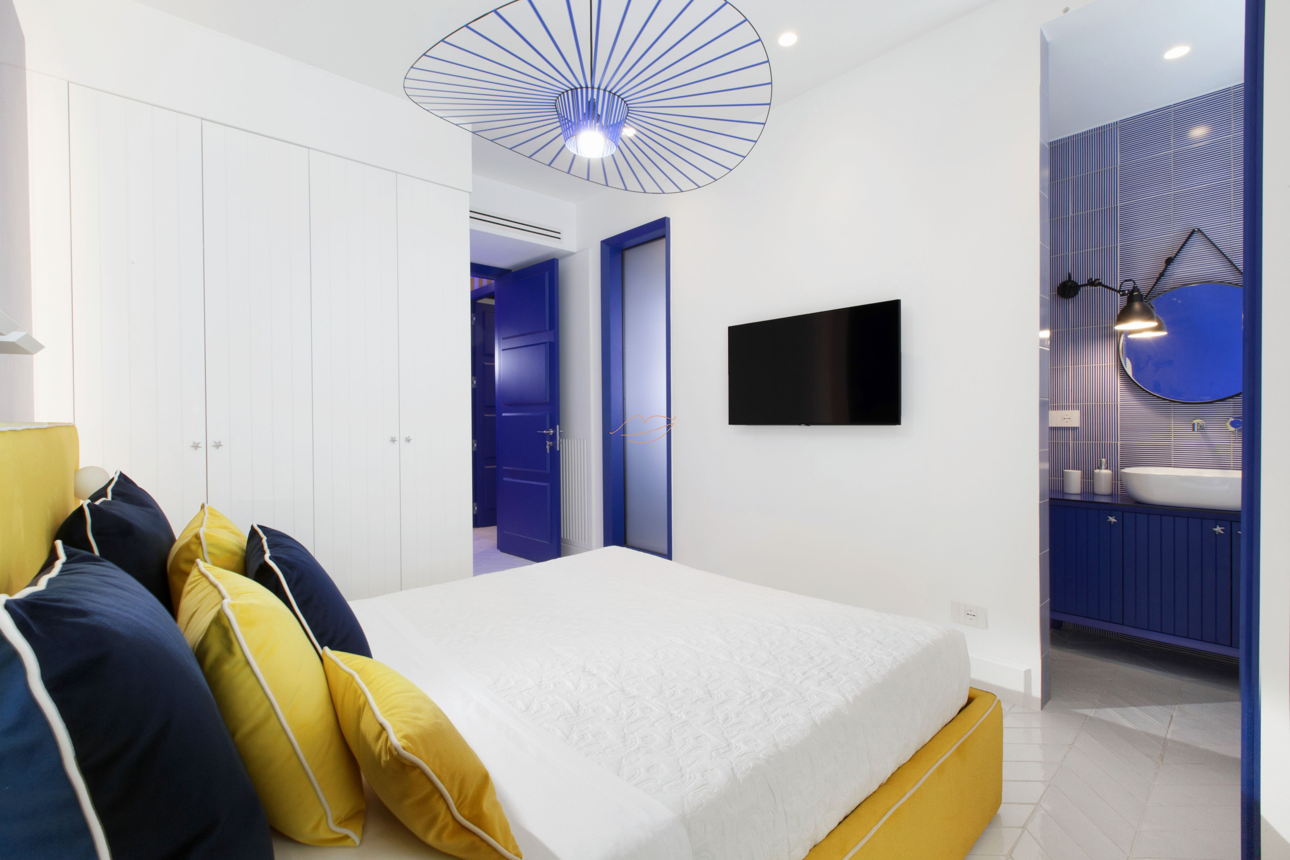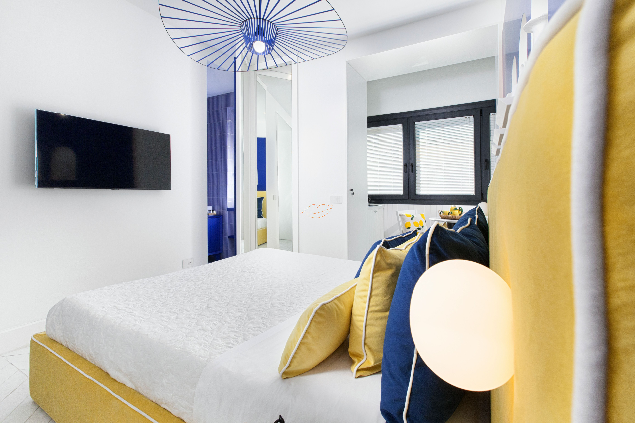 Casa Mama blu es un estudio con acabados de diseño inspirados en los colores del mar Mediterráneo y los colores de los limones de Sorrento.