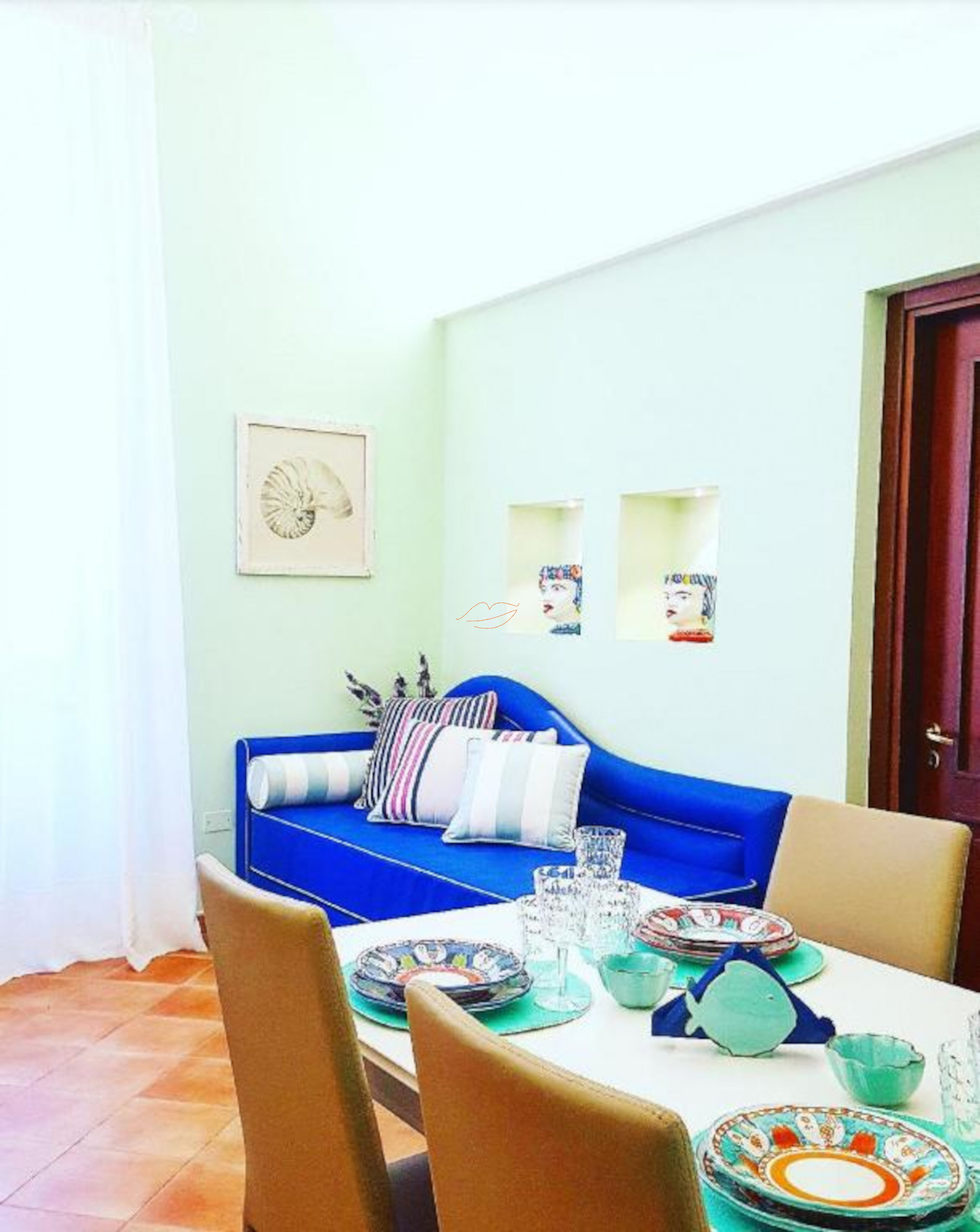Una casa típica junto al mar con colores suaves y tonos de azul, con muebles sencillos que recuerdan al pueblo marinero. La vivienda, caracterizada por un ambiente único en forma de cúpula, cuenta con una cama de matrimonio y un baño completo con bidé. La zona de estar incluye cocina equipada, mesa de comedor y dos pufs cama.