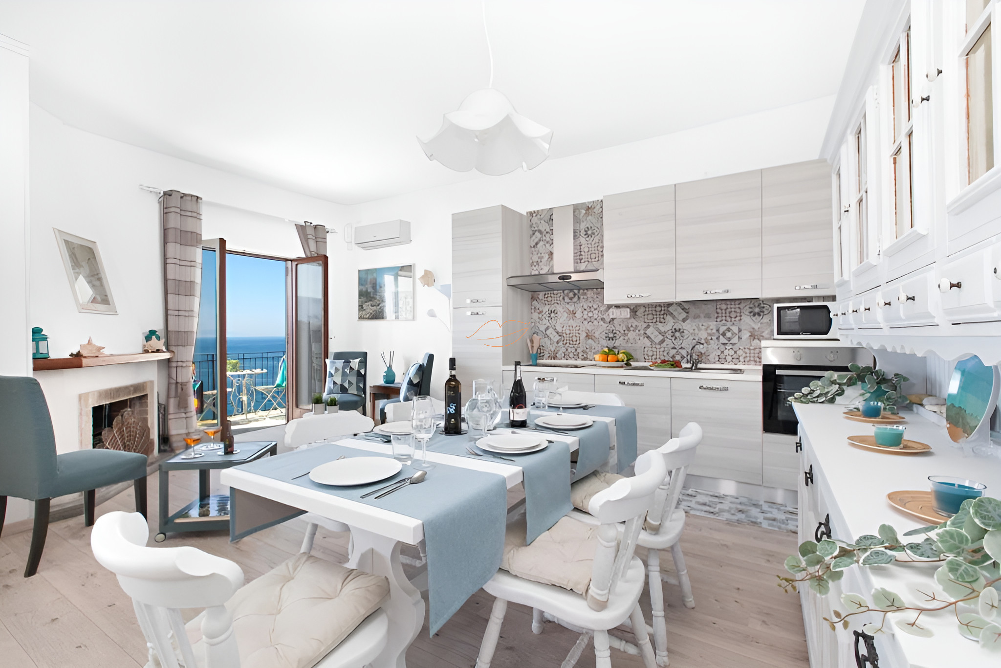 L'appartement dispose de deux chambres avec lit double, télévision à écran plat, l'une avec balcon et l'autre avec fenêtre, toutes deux équipées de climatisation. L'espace de vie, spacieux, lumineux et meublé avec goût, dispose d'un accès au balcon avec vue sur la mer, d'un canapé-lit, d'une cheminée, d'une grande table à manger, d'une télévision à écran plat, de la climatisation et d'une cuisine équipée avec réfrigérateur, four, micro-ondes, presse-agrumes, grille-pain, bouilloire, machine à café et plaque à induction, ainsi que tous les ustensiles nécessaires.