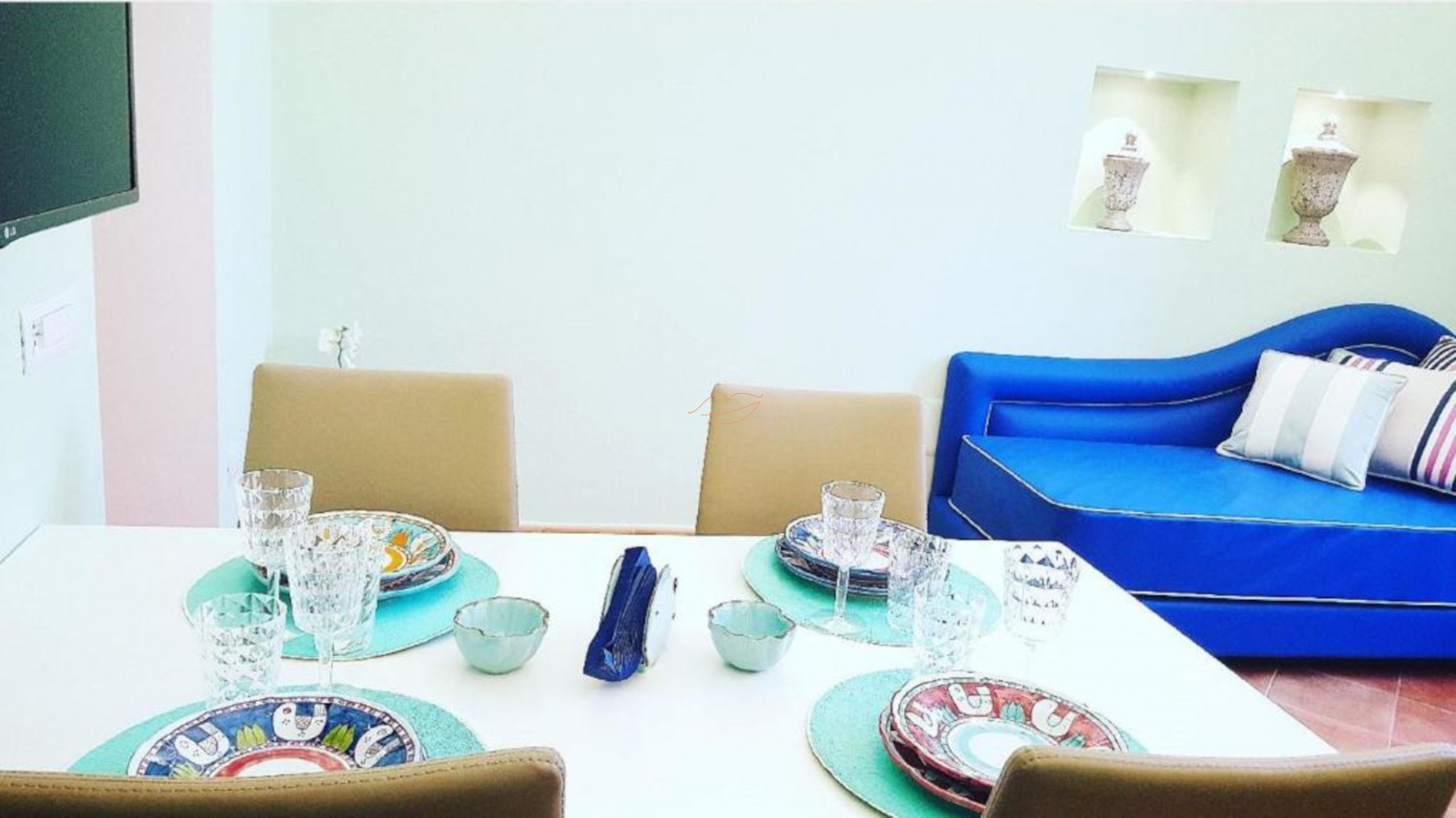 Une maison typique au bord de la mer aux couleurs douces et aux teintes de bleu, avec des meubles simples qui rappellent le village de pêcheurs. Le logement, caractérisé par un espace unique en dôme, dispose d'un lit double et d'une salle de bain complète avec bidet. La zone de vie comprend une cuisine équipée, une table à manger et deux poufs-lits.