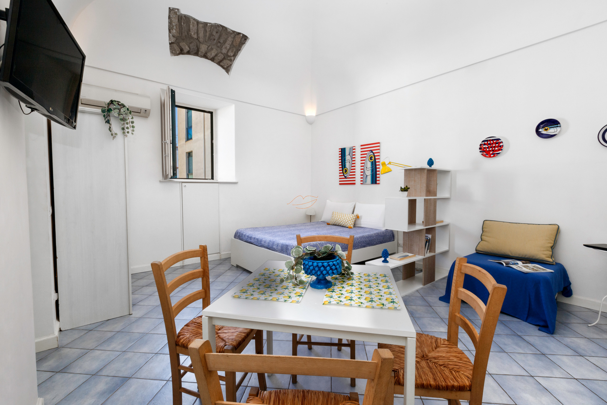 L'appartamento offre un letto matrimoniale su soppalco, un divano letto, bagno, cucina attrezzata a scomparsa, impianto di radiodiffusione. Dotato di connessione Wifi, consente accesso veloce ed illimitato al web. Dispone anche di impianto di aria condizionata e televisore.