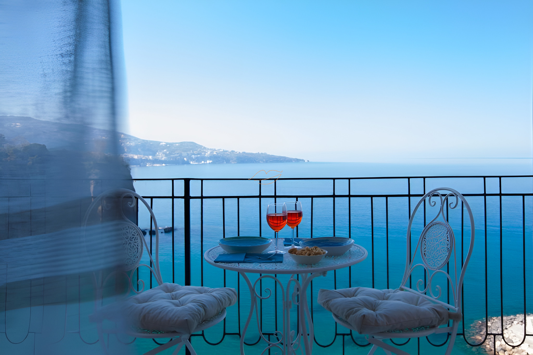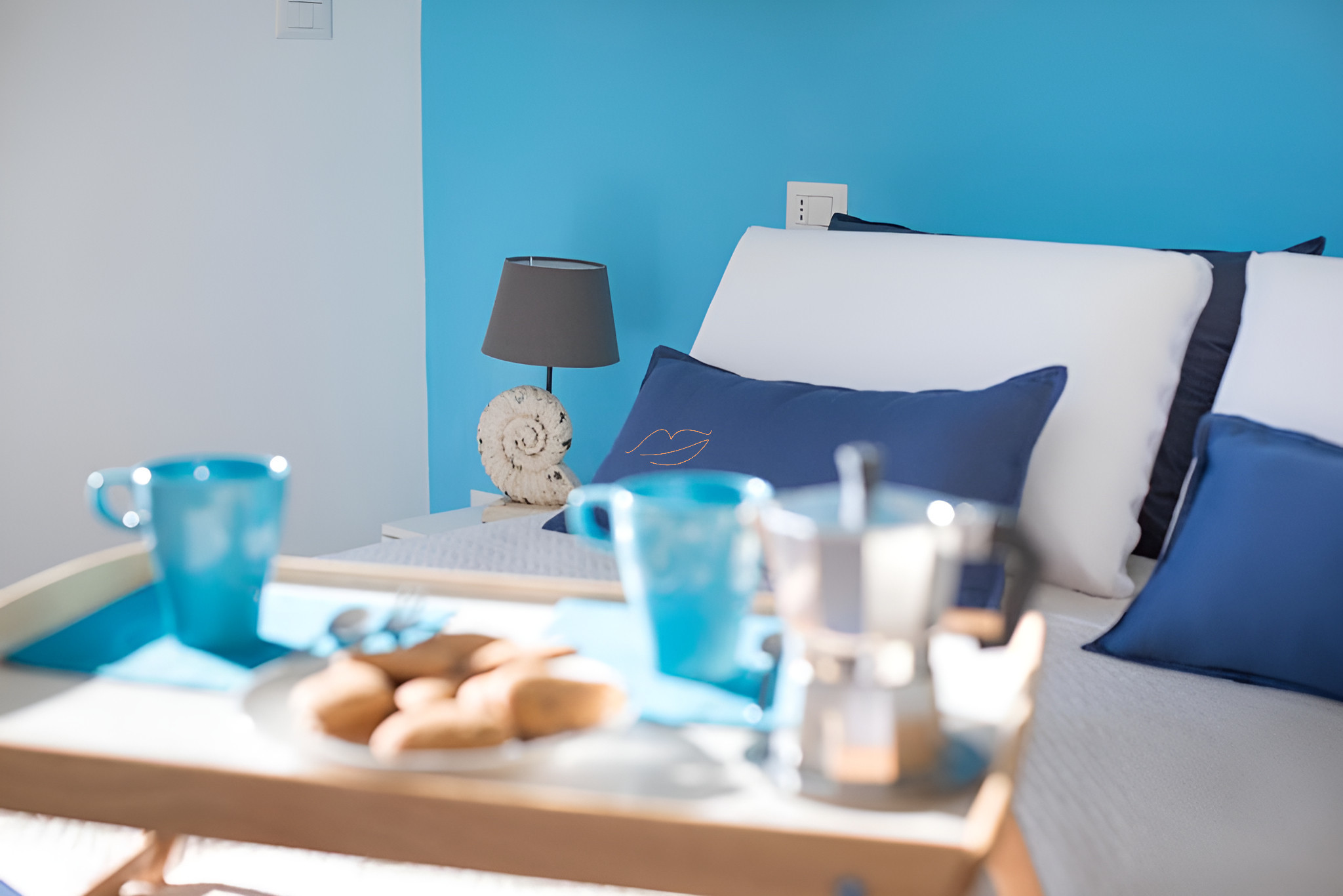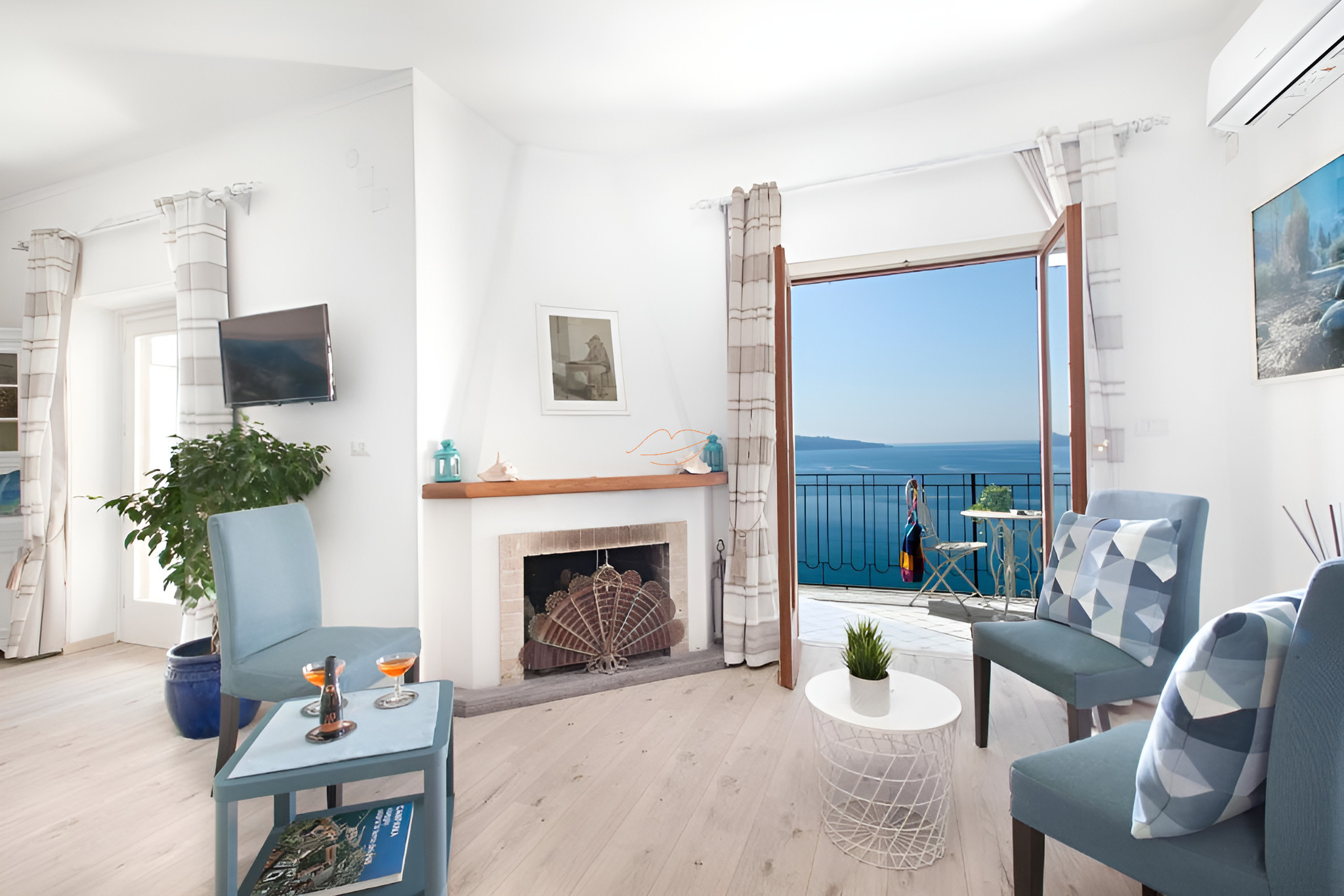 L’appartamento dispone di due camere da letto con letto matrimoniale, tv a schermo piatto, una con balcone e una con finestra, entrambe dotate di aria condizionata. La zona giorno, spaziosa, luminosa e arredata con gusto dispone di accesso al balcone con vista sul mare, divanoletto, caminetto, un grande tavolo da pranzo, tv a schermo piatto, aria condizionata e cucina attrezzata con frigorifero, forno, microonde, spremi agrumi, tostapane, bollitore, macchinetta per caffè e piano a induzione e tutti gli utensili necessari.