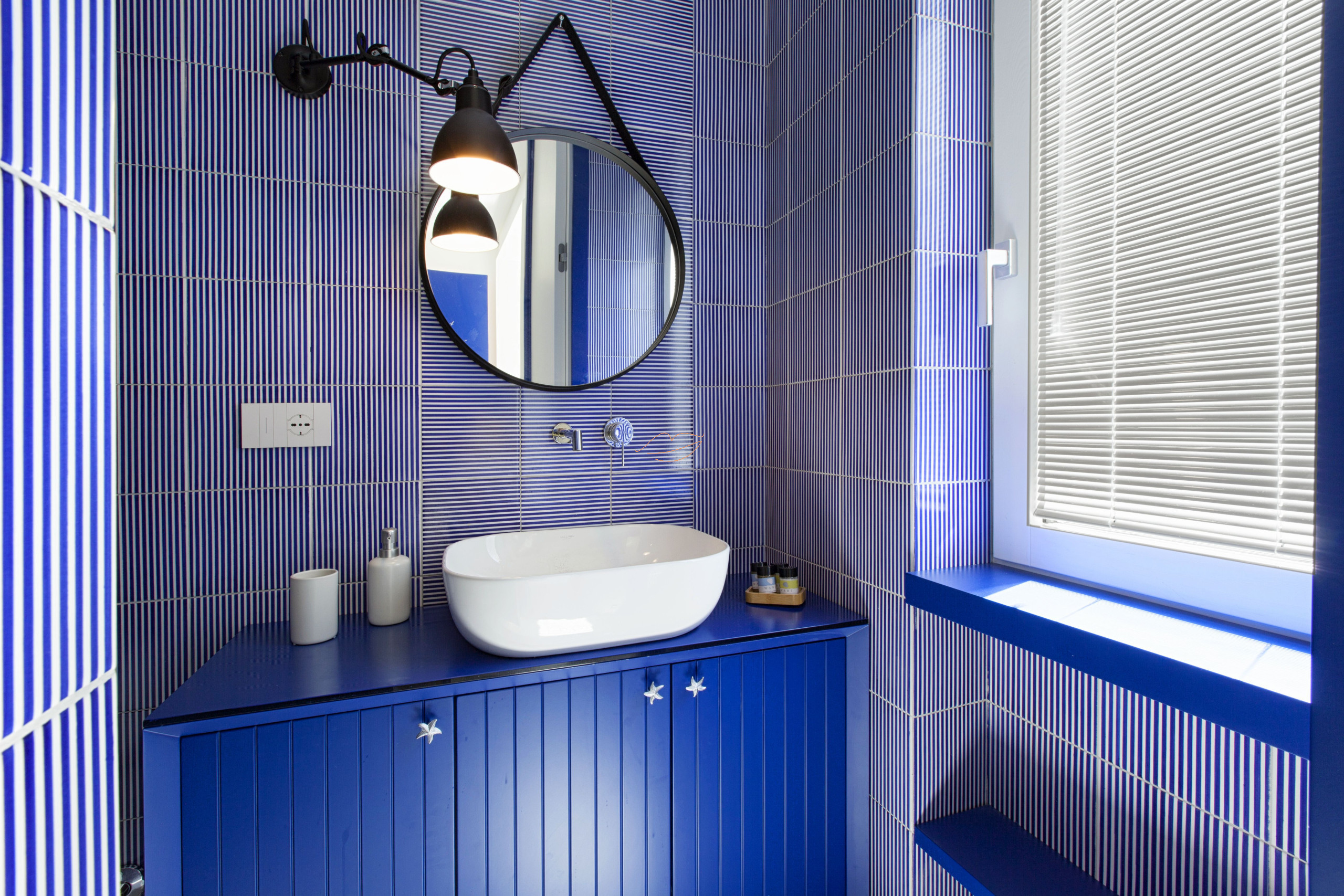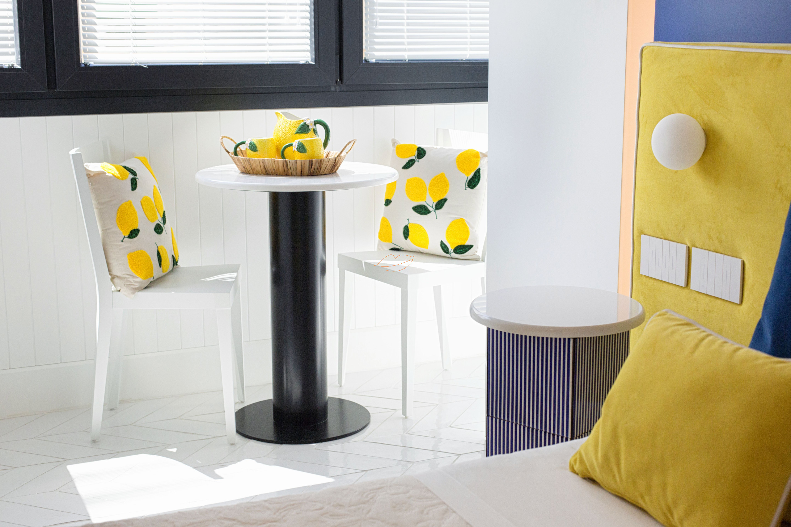 Casa Mama blu è un monolocale con finiture di design ispirate ai colori del mar Mediterraneo e ai colori dei limoni di Sorrento.