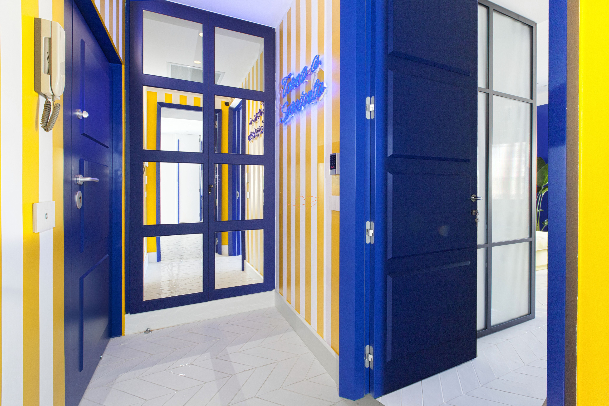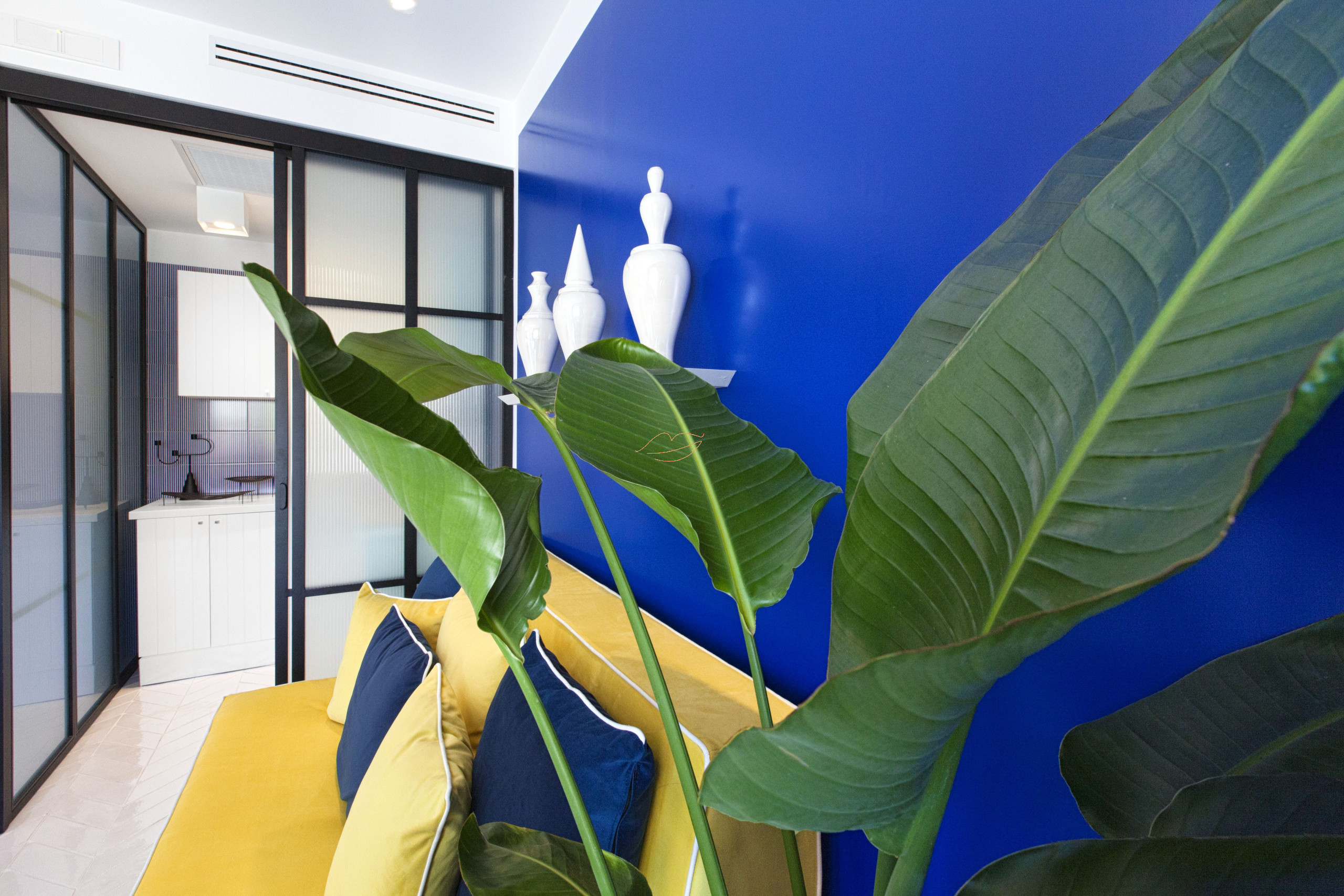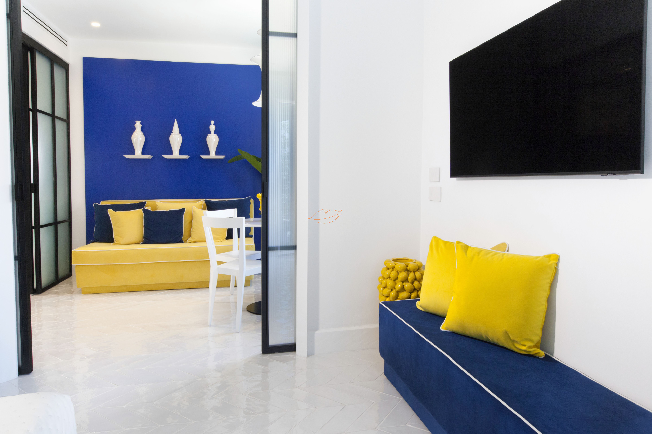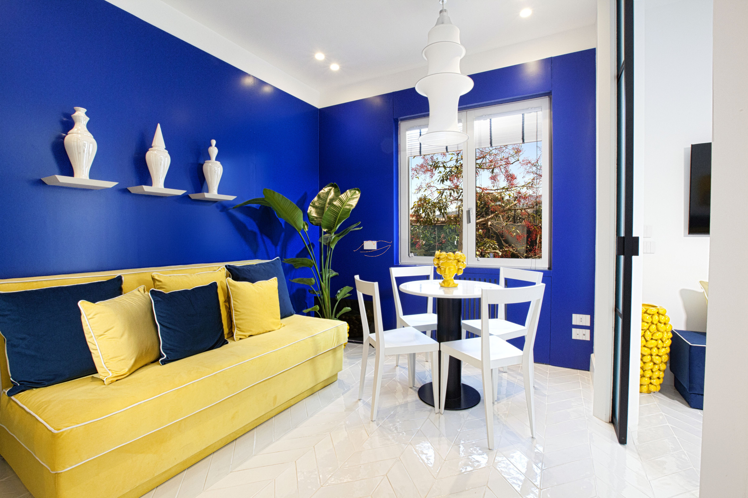 Casa Mama blu è un monolocale con finiture di design ispirate ai colori del mar Mediterraneo e ai colori dei limoni di Sorrento.