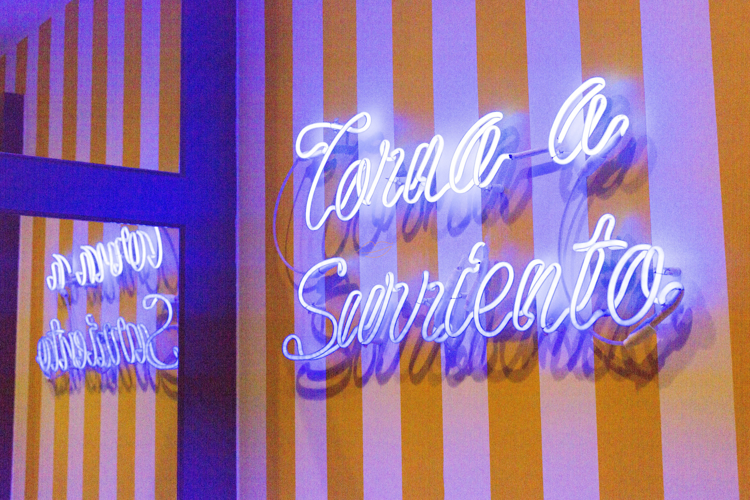 Entrando troviamo un piccolo ingresso condiviso arredato con l'altro apaprtamento arredato con la scritta con una scritta al led "Torna a Surriento" dove è a disposizione degli opsiti una lavatrice, aspirapolvere e spazio per riporre i bagagli.