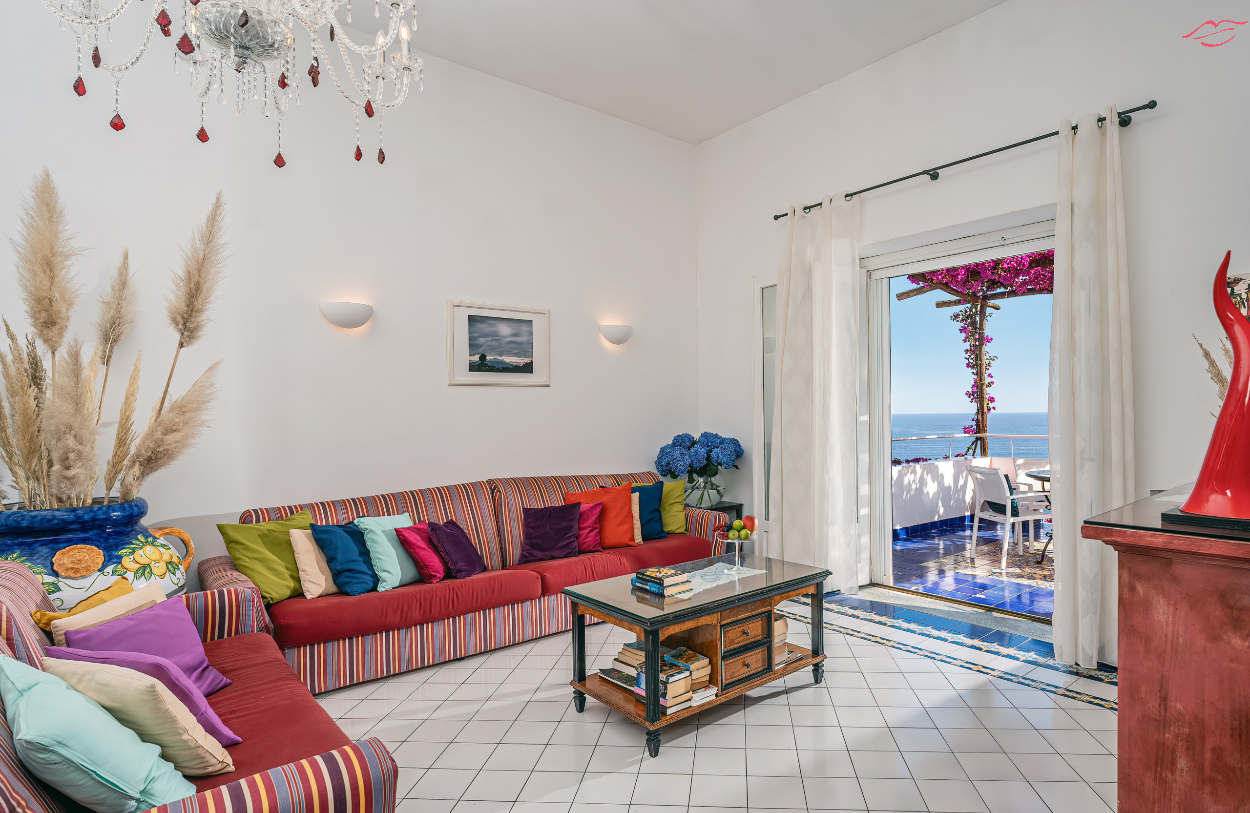 • Sunrise Suite con bagno privato con vasca idromassaggio: questa lussuosa suite dispone di un'ampia terrazza privata di circa 40 mq che si affaccia sulla splendida baia di Amalfi. La Sunrise Suite p dotata di un'area salotto vista mare, separata dalla camera da letto per maggiore privacy e comfort, corridoio in pietra e bagno con vasca idromassaggio. I mobili sono opere uniche della tradizione napoletana; il pavimento in cotto antico e la maiolica verde mare in stile vietrese rendono questa suite la più prestigiosa della villa. Su richiesta, possibilità di due letti aggiuntivi.