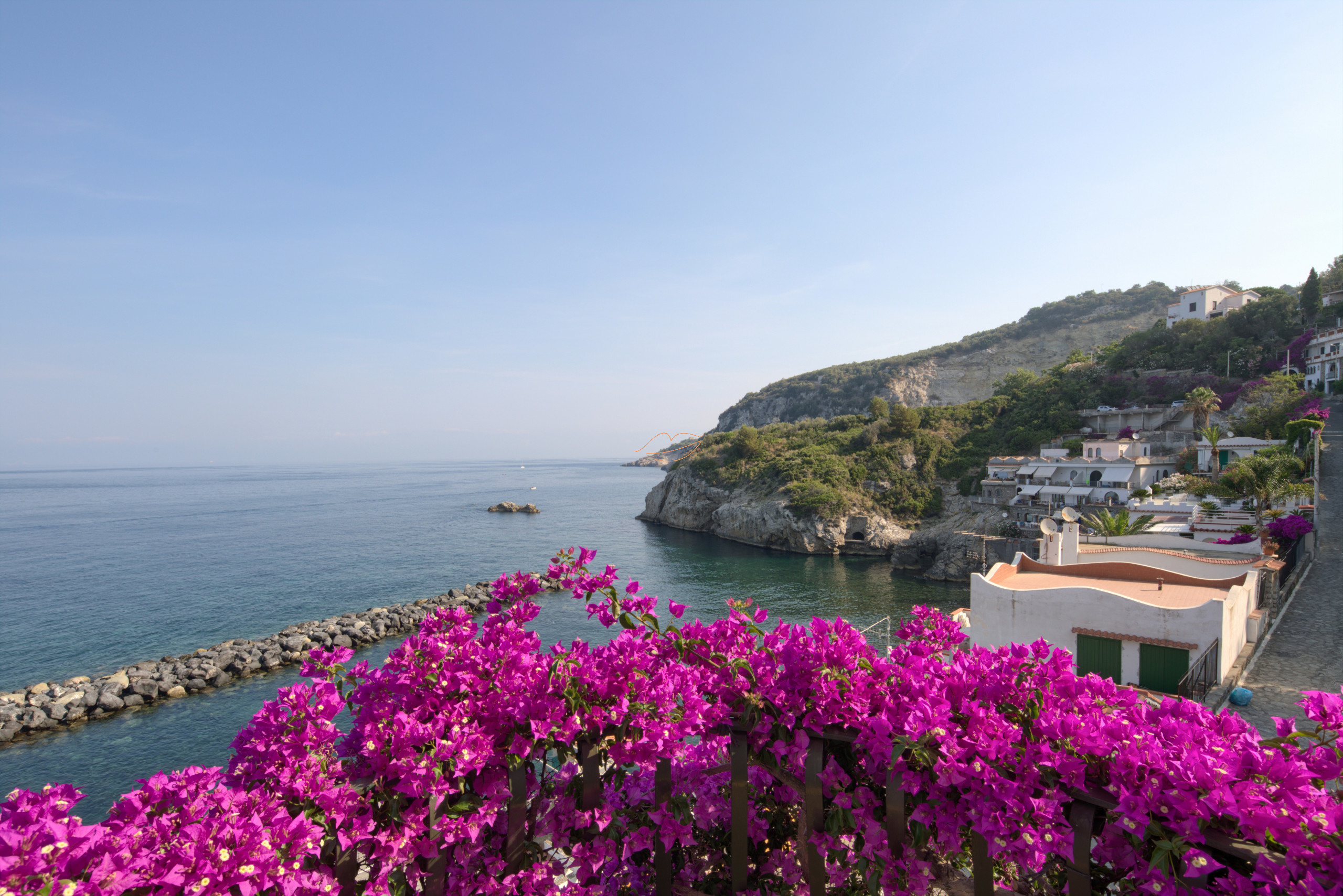 SAN MONTANO is a beautiful private riviera just a short walk from Massa Lubrense and less than a 10-minute drive from Sorrento. The riviera has a free pebble beach with the possibility of renting deckchairs , sunbeds and umbrellas. Its unique geographical position gives it a 360-degree view of the gulf, from which it is possible to see Capri, Ischia and Procida at the same time. The accommodation is surrounded by luxury villas of a small elite.
