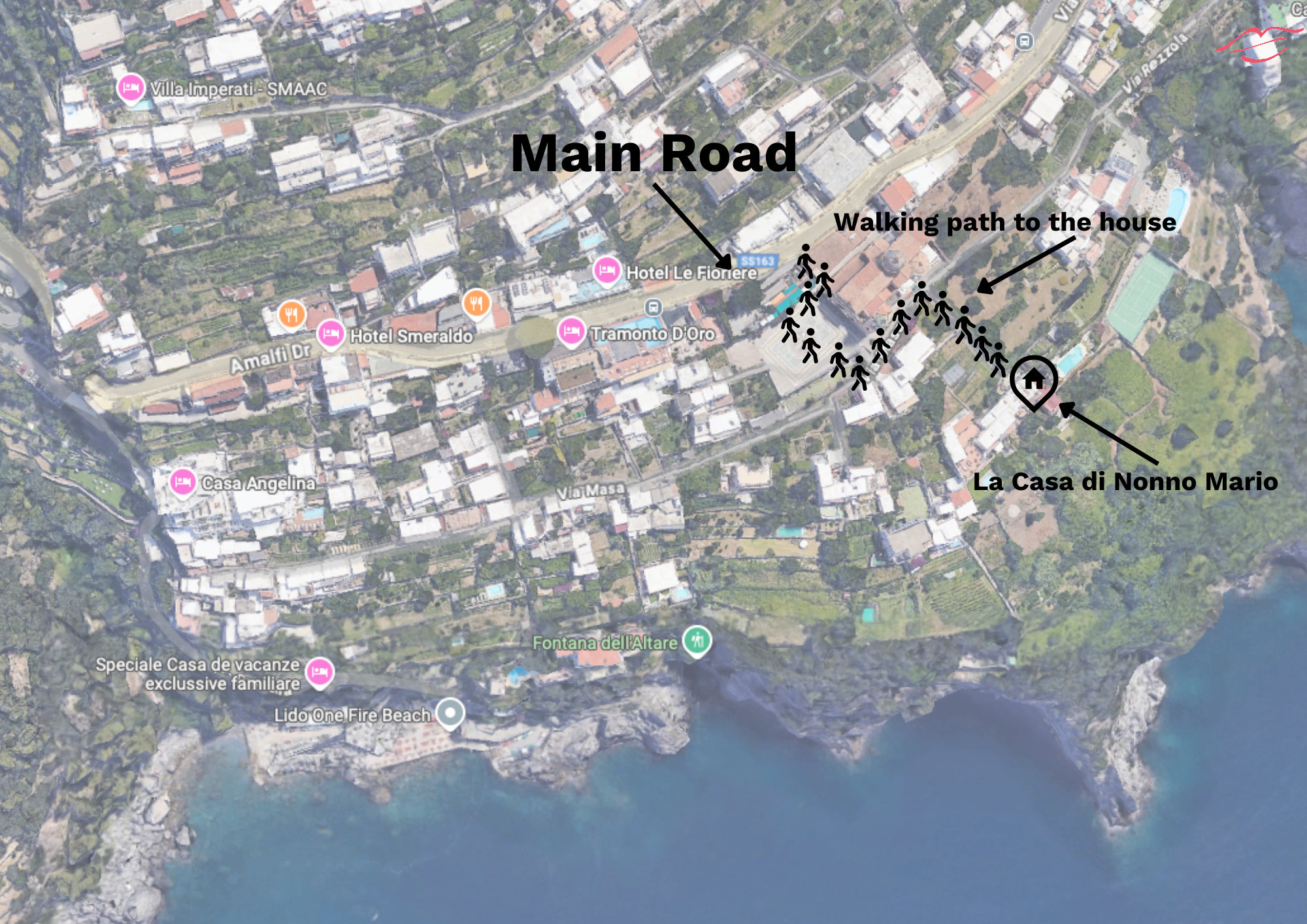 NOTE: All these locations can only be reached by descending or ascending stairs, due to the typical layout of Praiano, where many services are located lower/higher than the house.