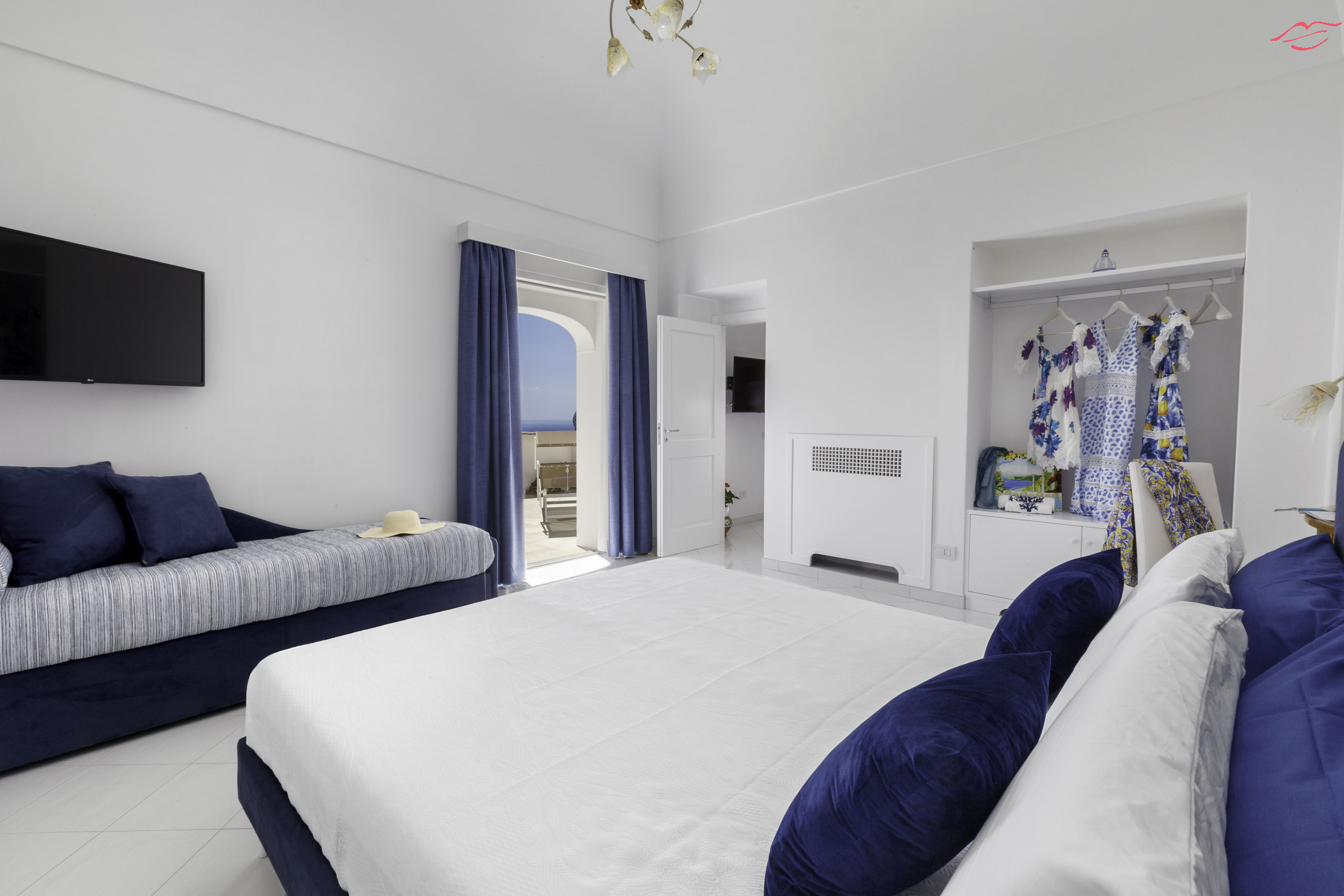 The large outdoor terrace enjoys a wonderful sea view, equipped with outdoor sunbeds, sofas and armchairs, shower, a perfect location for relaxing evenings and romantic dinners. The apartment has air conditioning, WiFi and an iron.